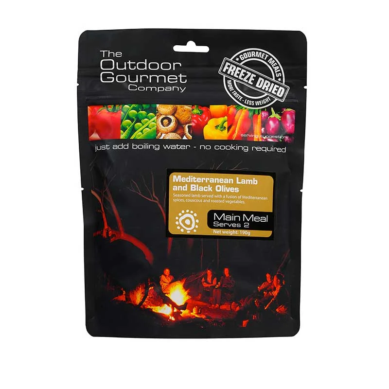 You may be shivering in your tent high up on an alpine peak or camping under the stars on the Larapinta trail but thanks to the Outdoor Gourmet Company you will instantly be transported to the coast of the Mediterranean with their Mediterranean Lamb and Black Olives! Accompanied with couscous and roasted vegetables this freeze dried meal is packed with energy and packed with flavour.