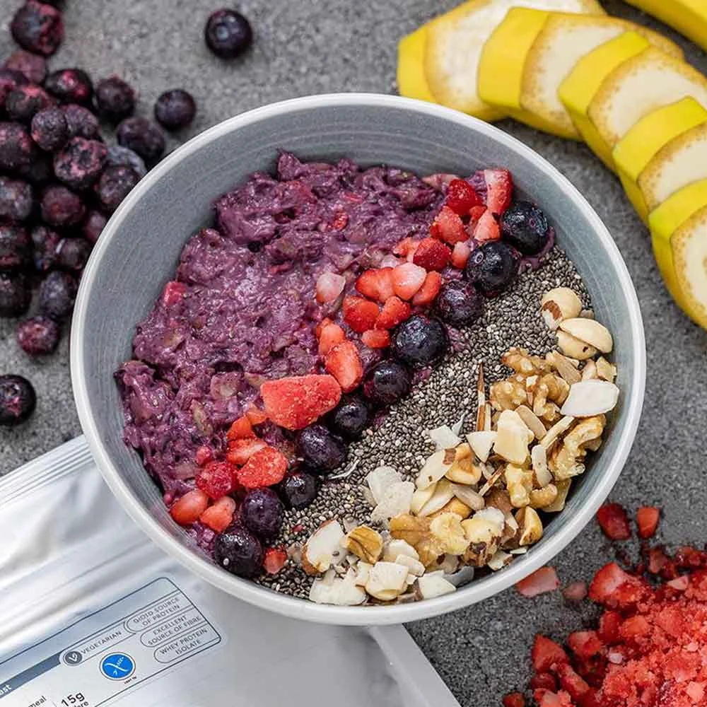 Strawberry (28%), Blueberry (21%), Banana Powder, Organic, Millet Puffs, Sunflower Seeds, Organic Coconut Milk [Includes Tapioca Based Maltodextrin], White Rice, Blackcurrant Powder, Almonds, Pea Protein Isolate, Prebiotic Dietary Fibre (Inulin), Chia Seeds, Millet Puffs, Brown Rice Protein, Hazelnuts