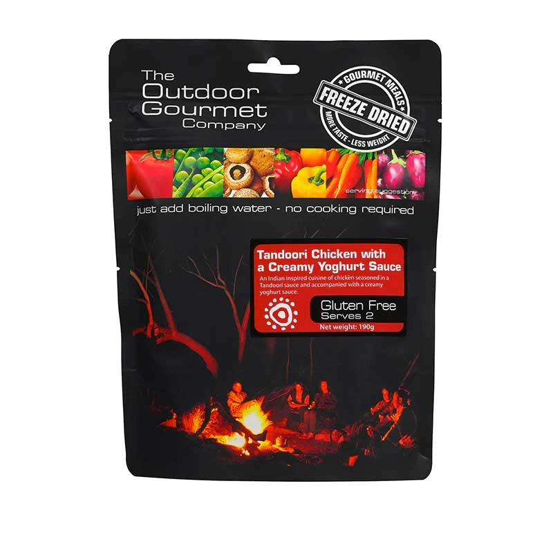 Bring the fullest flavours of India right to your tent vestibule with Tandoori Chicken from The Outdoor Gourmet Company. Once re-hydrated you’d never believe it began life as a freeze dried meal. The seasoned chicken is topped wiht a creamy yogurt sauce and will satisfy even the most fussy of foodies after a big day in the backcountry.Â