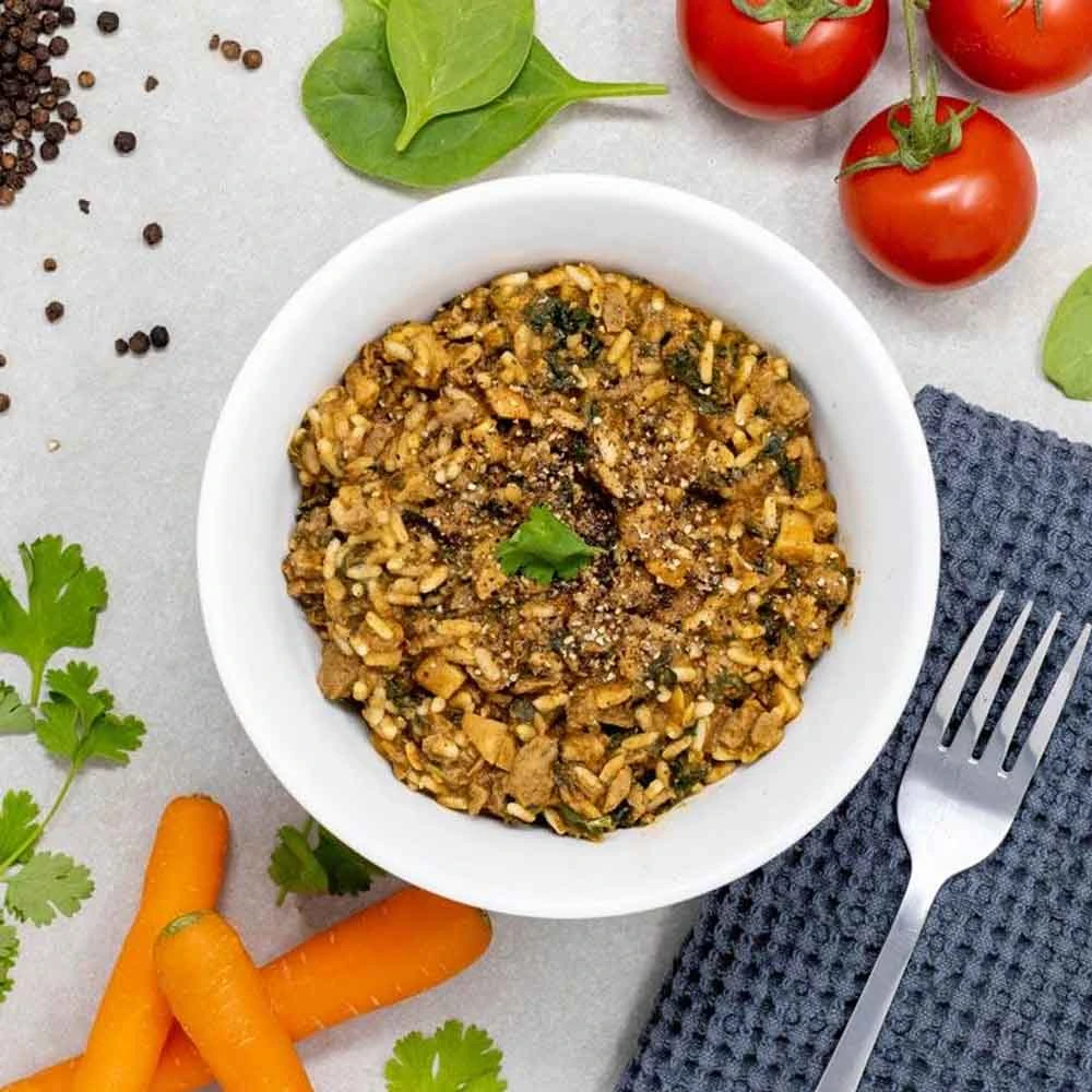 Tomato [Includes non-GMO maize starch 2.4%], Grass-Fed Lamb (22%) [Grass-Fed Lamb (90%), Organic Rice Flour, Parsley, Ginger, Pink Himalayan Salt, Rosemary Extract, Sunflower Oil], White Rice, Carrot, Spinach, Organic Olive Oil, Organic Coconut Milk [Includes Tapioca Based Malotdextrin], Pea Protein Isolate, Cumin, Organic Brown Rice Protein, Coriander Leaf, Pink Himalayan Salt, Smoked Paprika, Black Pepper.